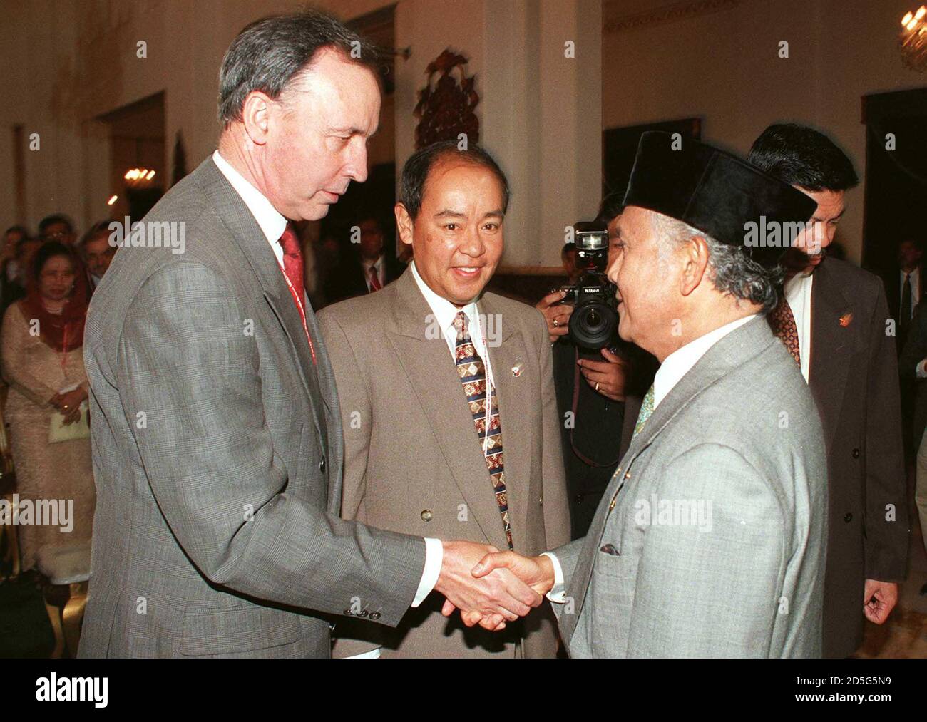 Former Australian Prime Minister Paul Keating L Shakes Hands With Indonesian President B J Habibie R As Former Philippine Secretary Of Finance Roberto De Ocampo C Looks On During The Opening Day